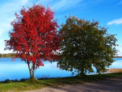 De två rönnarna vid sjöstranden visar hur olika rönnar kan vara i färgsättningen och den höstliga tidtabellen.